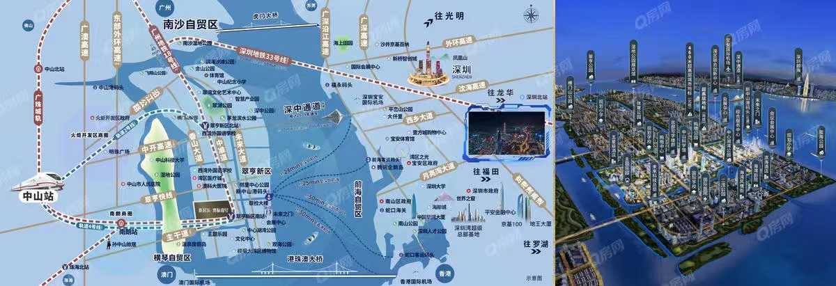 馬鞍島坐擁灣區(qū)中心最矚目的世界級跨海通道工程——深中通道,預(yù)計2024年開通,深中通道通車后從中山快速抵達深圳,通勤時間由原來的2小時縮減為15分鐘,馬鞍島更是政府大力發(fā)展的灣區(qū)西重要交通樞紐。周邊有7大軌交(中山地鐵2號線、4號線、廣州地鐵18號線、深中城際33號、3大高鐵站)、5大高速、5大機場、2大碼頭環(huán)伺,而本項目正好在廣州地鐵18號線中山延長線(規(guī)劃中)以及中山地鐵4號線翠亨新區(qū)站上以及中山地鐵4號線(規(guī)劃中)旁。